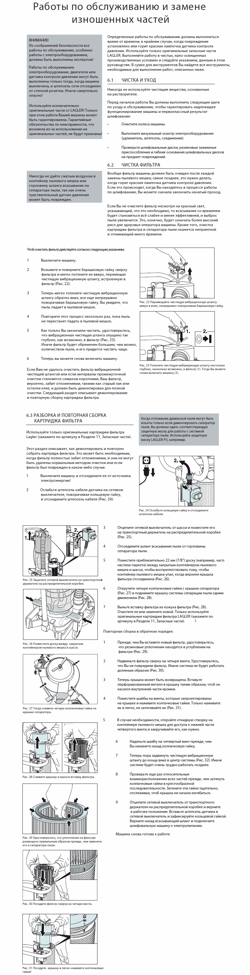 К.огда отложения древесной пыли могут быть изъяты только если демонтировать сепаратор пыли, Вы должны одеть соответствующую защитную маску для работы с системой сепаратора пыли. Используйте защитную маску LAGLER P3, например.