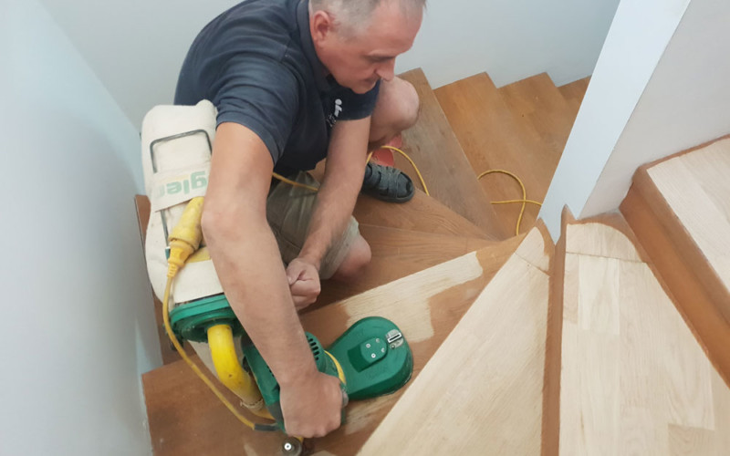 На первом этапе реставрационных работ мы только очищаем лестницу от старого покрытия и зашлифовываем все неровности и шероховатости, возникшие в процессе эксплуатации. В труднодоступных местах применяется эксцентриковая шлифовальная машина Makita, так чтобы обработка была точной. Ровные поверхности, такие как ступени и торцы, шлифуются с помощью шлифовальной машины для паркета Lägler Flip. После окончания шлифовки все пазы и щели очищаются от пыли и опилок промышленным пылесосом Hilti.