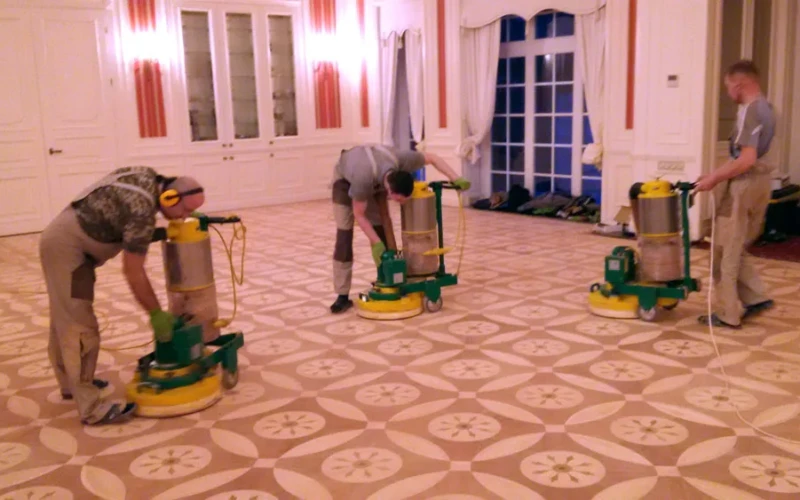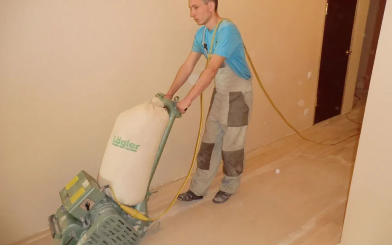 Используются профессиональные безпылевые шлифовальные машины, которые аккуратно снимают старое покрытие и выравнивают поверхность.